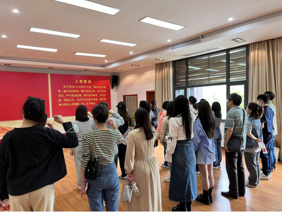 在习近平总书记视察峒山陈列室,大家认真观看习近平总书记与峒山当地群众亲切互动的照片,深刻领悟习近平总书记视察鄂州时的重要讲话和对农村、农业工作的重要指示精神。在音乐学院党总支书记带领下,全体党员重温入党誓词。
