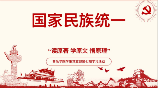2024年5月23日下午15:30,音乐学院学生党支部第七期“学习贯彻习近平新时代中国特色社会主义思想主题教育”系列活动在虎泉校区习文楼103教室举行。本次活动以“民族国家统一”为主题,由学生党支部书记成征主持。音乐学院党总支书记郑伏荣、专职组织员曹琳、学生党支部全体成员、学生入党积极分子参加了此次读书班学习活动。