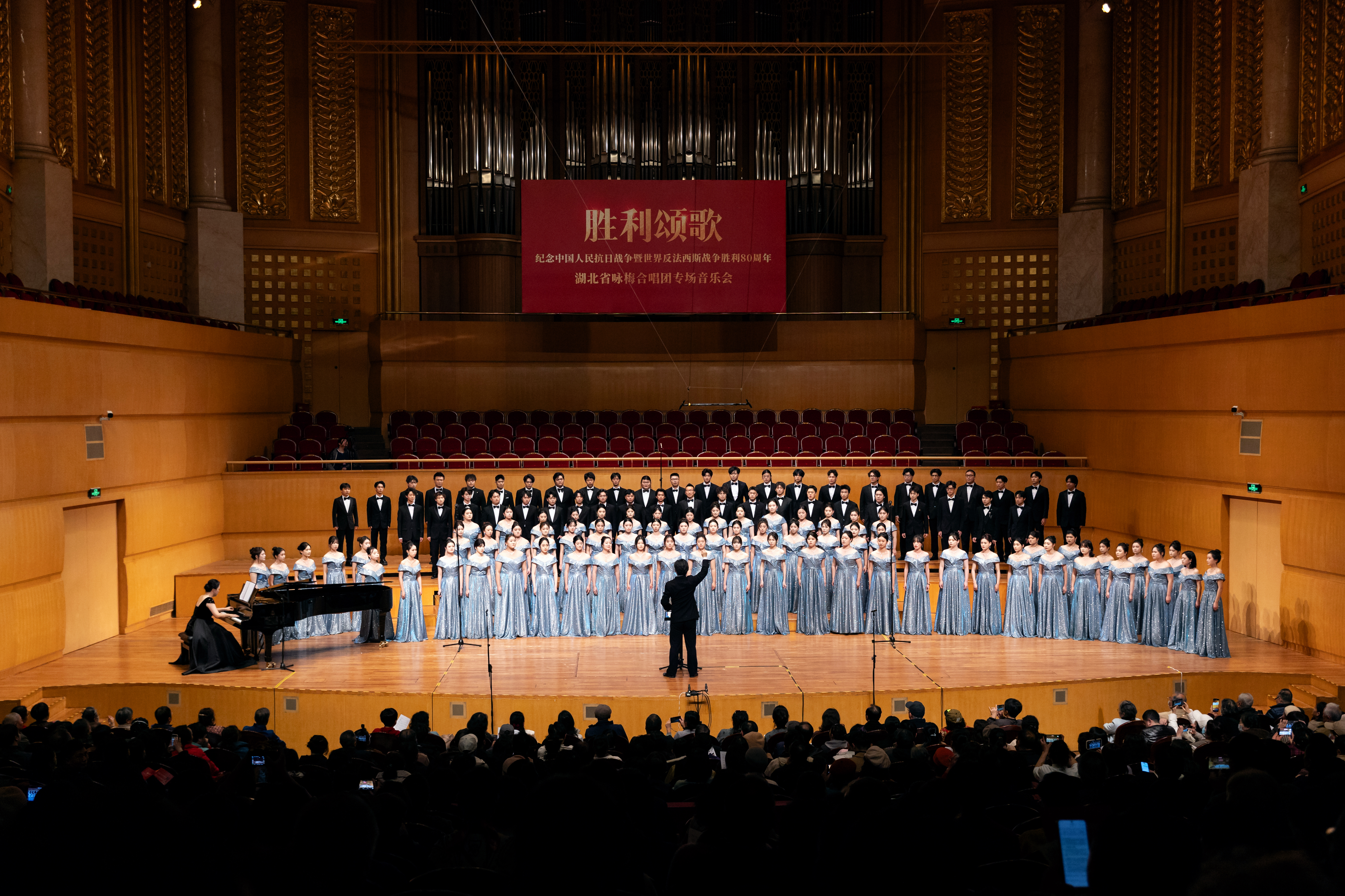 2025年12月16日晚,武汉琴台音乐厅内掌声阵阵,湖北艺术职业学院演艺学院合唱团携手咏梅合唱团、层林尽染男声合唱团,共同献上《胜利颂歌 —— 纪念中国人民抗日战争暨世界反法西斯战争胜利 80 周年》合唱专场音乐会。湖北艺术职业学院党委委员、纪委书记蔡艳青,党委委员、副院长罗辉,演艺学院党总支书记叶芬等领导与老师们亲临现场观看演出。