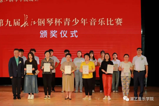 仪式最后,校企双方领导为第九届长江钢琴杯音乐比赛获奖选手代表和张晓晓、高轶珺、孙琼、刘静、曾征、胡艺(小)6名优秀指导老师导表进行了颁奖。
