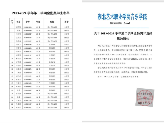音乐学院充分发挥榜样引领作用,表彰优秀学生,树立学风标杆,带动同学追求上进。学院对两个年级24名学生进行了表彰并颁发了“全勤奖”荣誉证书,鼓励同学们积极营造向榜样看齐,激励学院全体学子创先争优、砥砺奋斗,切实发挥学生朋辈教育引领作用,营造“比、学、赶、帮、超”的浓厚氛围。