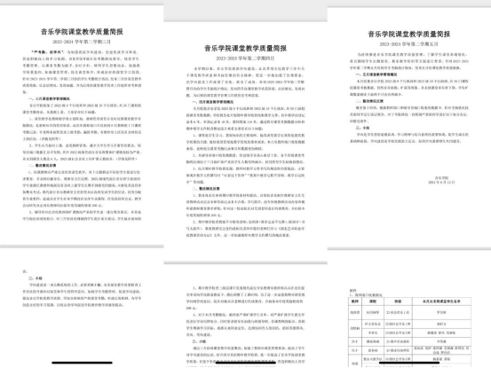 音乐学院通过对现有制度体系的分析,结合工作实际查找漏洞和不足,推进课堂教学质量管理,每月收集整理并发布课堂教学质量简报。院领导班子、辅导员、班级导师与专业教师共同开展全院考勤督导,以课堂考勤为抓手,及时分析、研判学生思想动态,加强课堂管理,优化课堂秩序,形成良好的课堂学习氛围,通过一系列抓手,大力整顿了教学秩序,促进了课堂学风班风建设。
